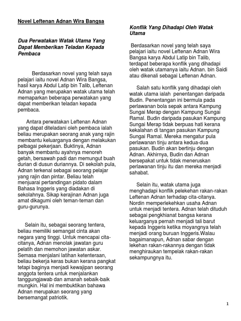 Komponen sastera dan novel BM bahasa melayu. NOVEL TINGKATAN 4 LEFTENAN ADNAN WIRA BANGSA Aspek KOMSAS Huraian Tema Semangat cinta akan tan. Dia juga merahsiakan keturunannya demi keselamatan keluarganya.